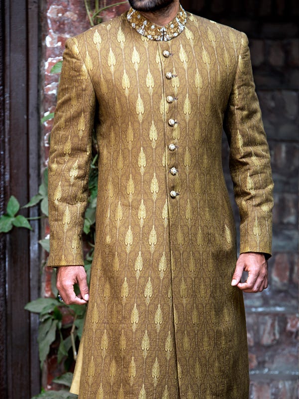 | Short Description | NOTE: All custom orders are paid in advance via Online Payment or Bank transfer only Hand woven self design cotton jamawar fabric sherwani stitched in traditional cut and designed with zardozi work on collar and buttons