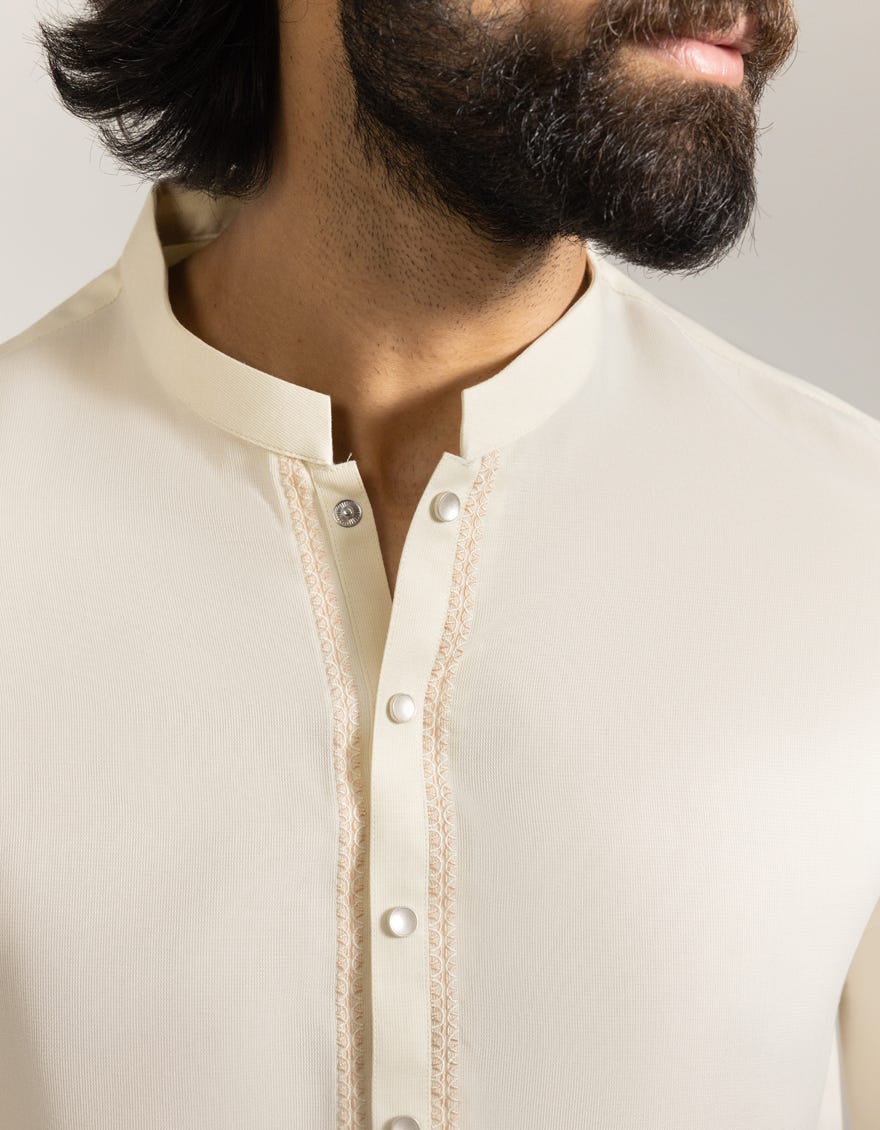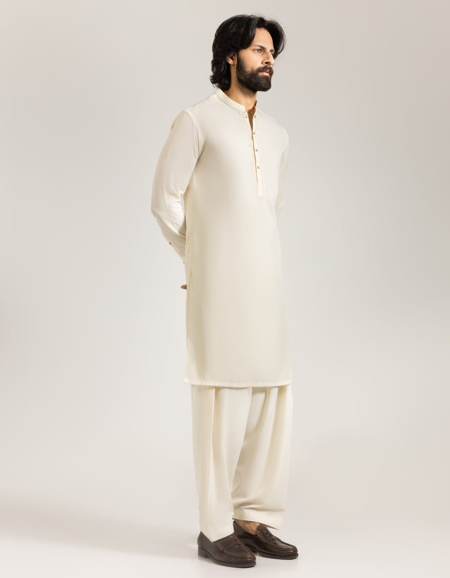 Upgrade your look with this cream blended semi-formal kameez shalwar, which mixes traditional and modern styles for a classy yet comfortable outfit.