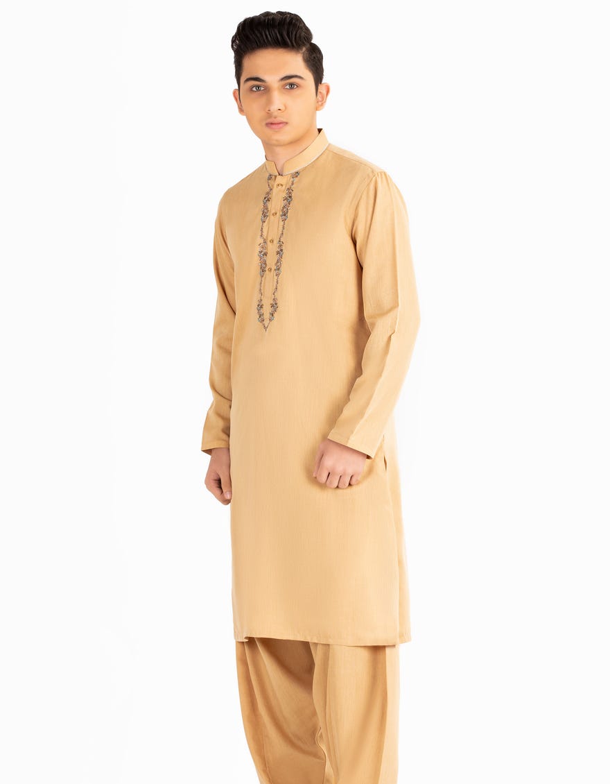 Short Description Semi-Formal Suit For Teen Designed With Computerized Embroidery On Collar & Front Used Contrast Applique.