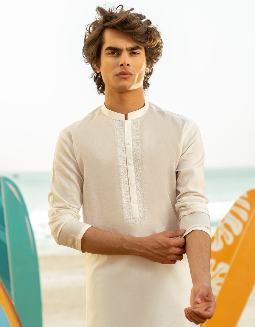 Explore our latest teen boys' Off White Cotton Kurta, designed with a blend of classic simplicity and Eastern charm. These kurtas offer a stylish yet understated look, suitable for a variety of occasions.