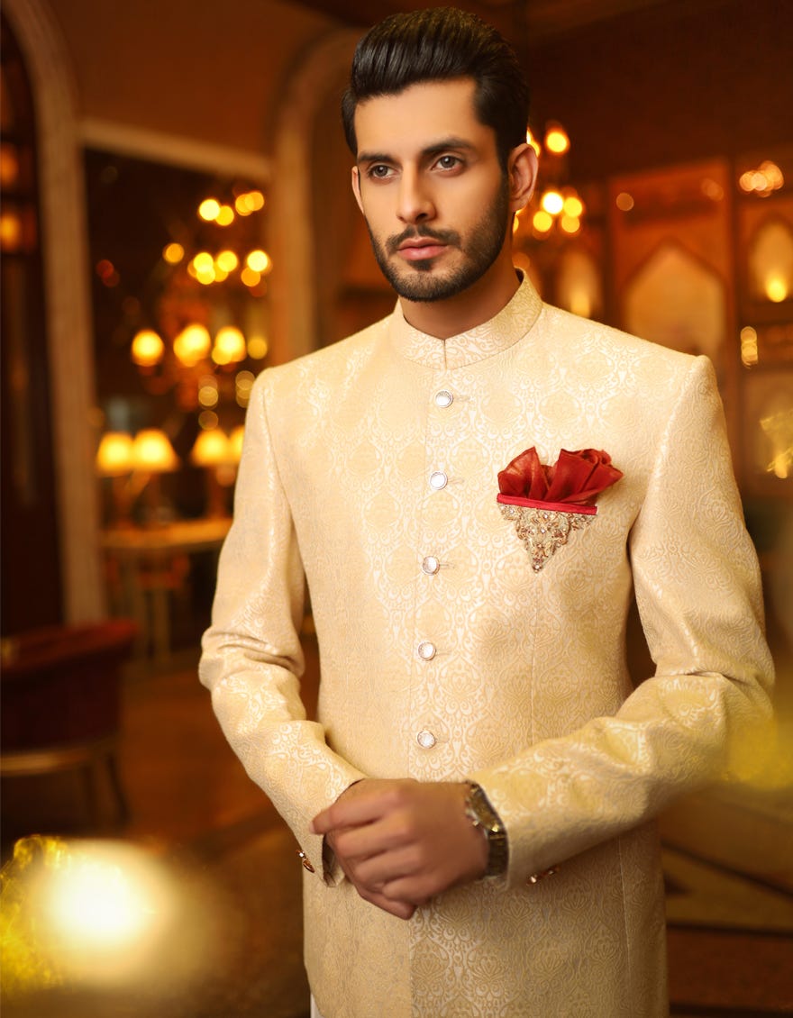 Formal Prince Coat for Men on Jamawar Fabric with Hand Embroidery on Front Pocket.