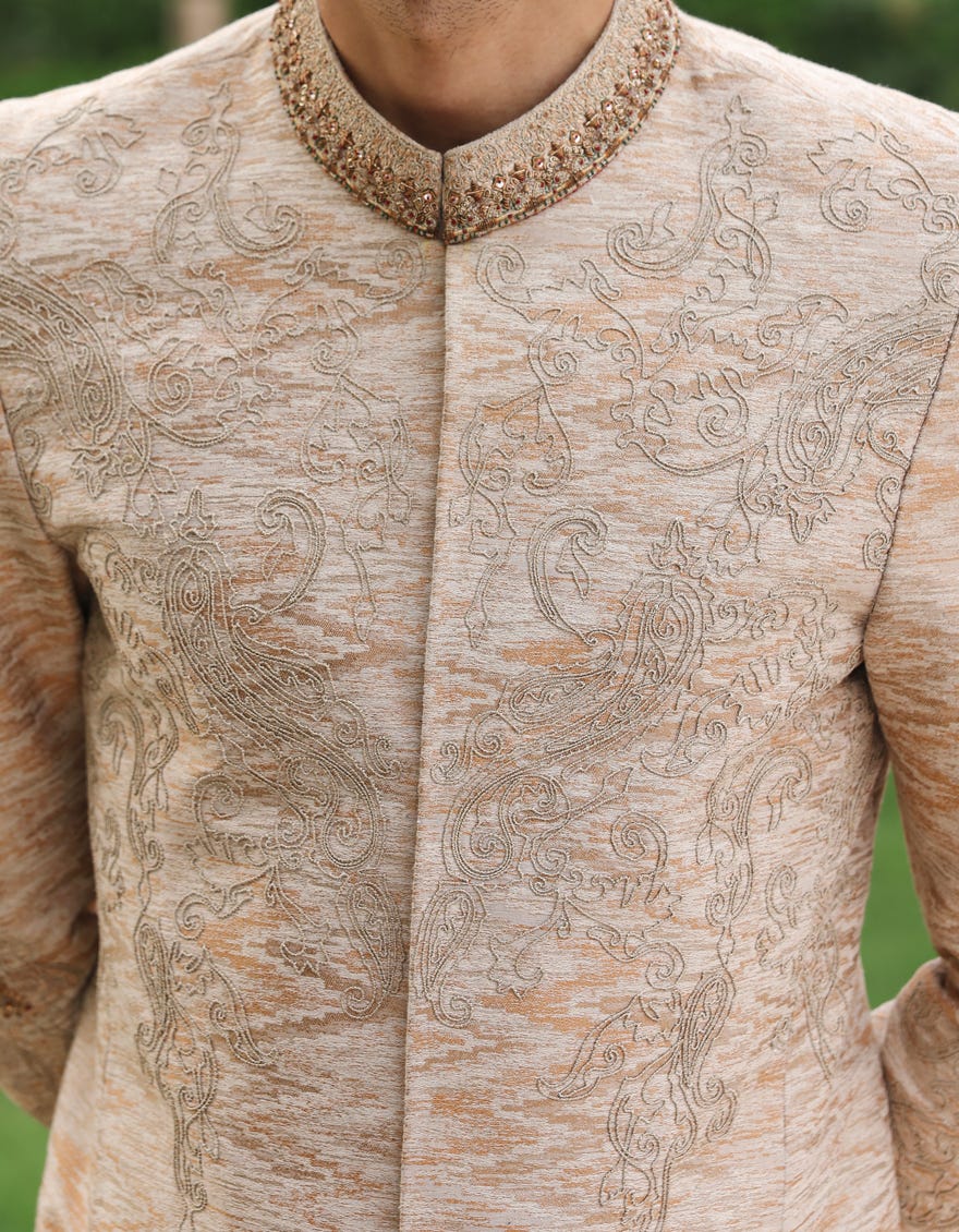 Beige self ikkat technique mat jamawar sherwani in traditional cut, embellishment on the collar, and embossed dori embroidery technique on the front.