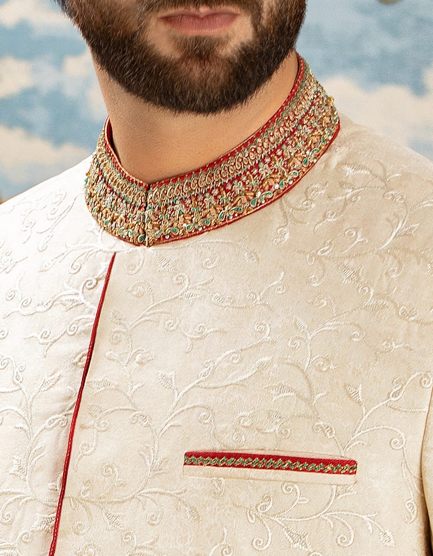 Traditional Men’s Sherwani With Contrast Machine and Hand Embroidery On Collar & Sleeves. With the Same Style on Pocket Top. Hidden Button Style Placket With Contrast Fabric Detail.