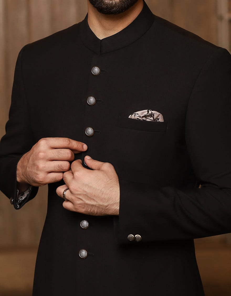 Black Elegant Traditional Sherwani for Grooms Made With Self Stripe Suiting With Printed Pocket Square & Printed Inner Lining.