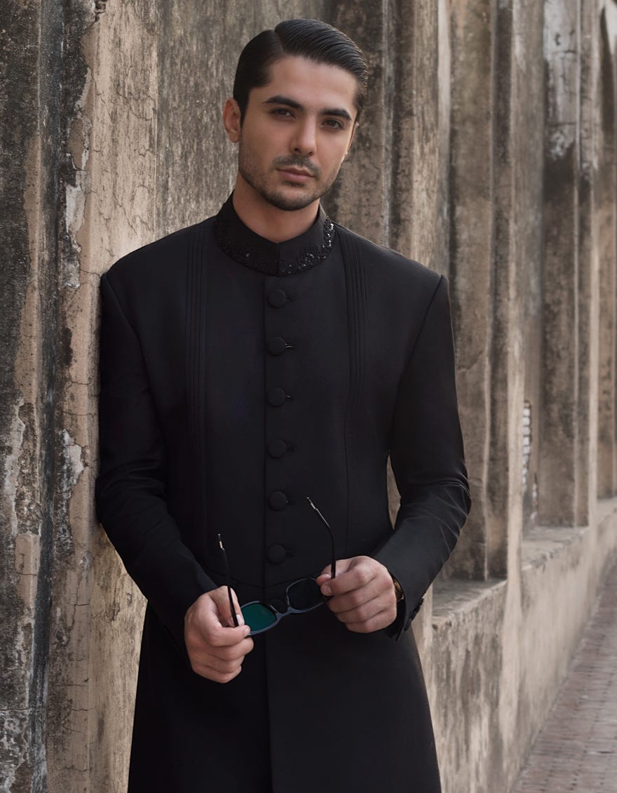 | Short Description | Black Designer's Edition of Pleated Sherwani With Embroidered Collar & Matching Buttons With Complimentary Inner Suit. |