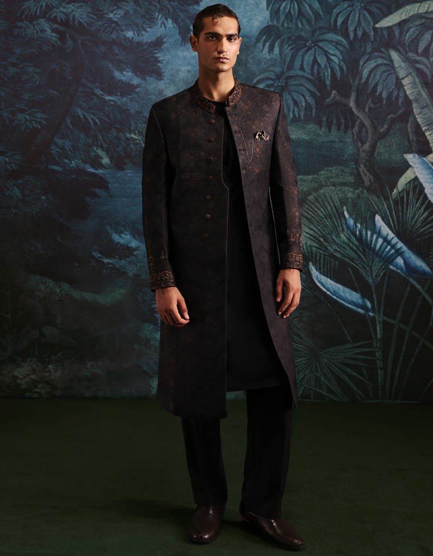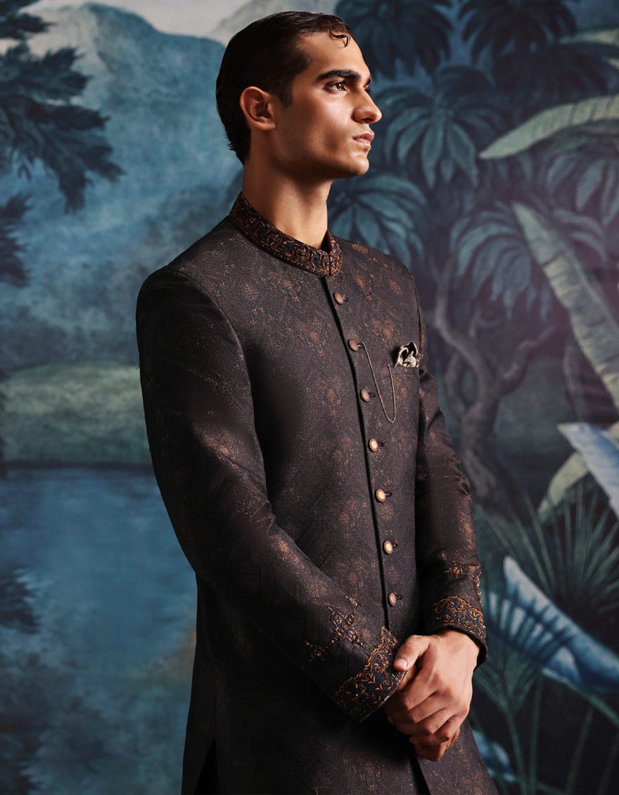 | Short Description | Dark rust copper sherwani with light glittery texture in traditional cut embellishment on collar and sleeves with decent and settle embroidery contrast with printed pocket square which creates its elegance and simplicity. |
