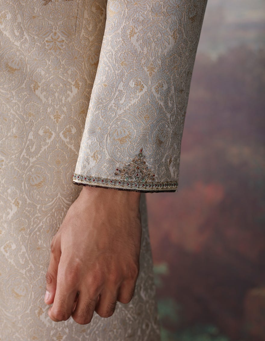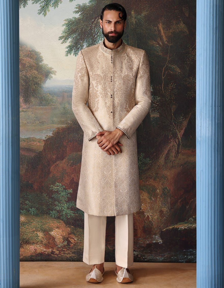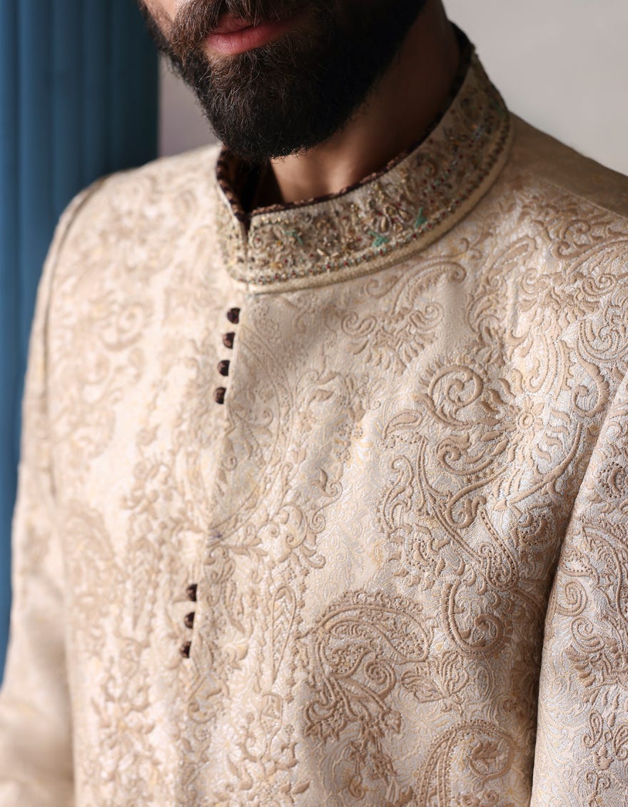 Short Description Dull gold - self-jacquard embossed texture sherwani for groom’s men collection in tradition cut heavy embellishment on collar, front and sleeves.