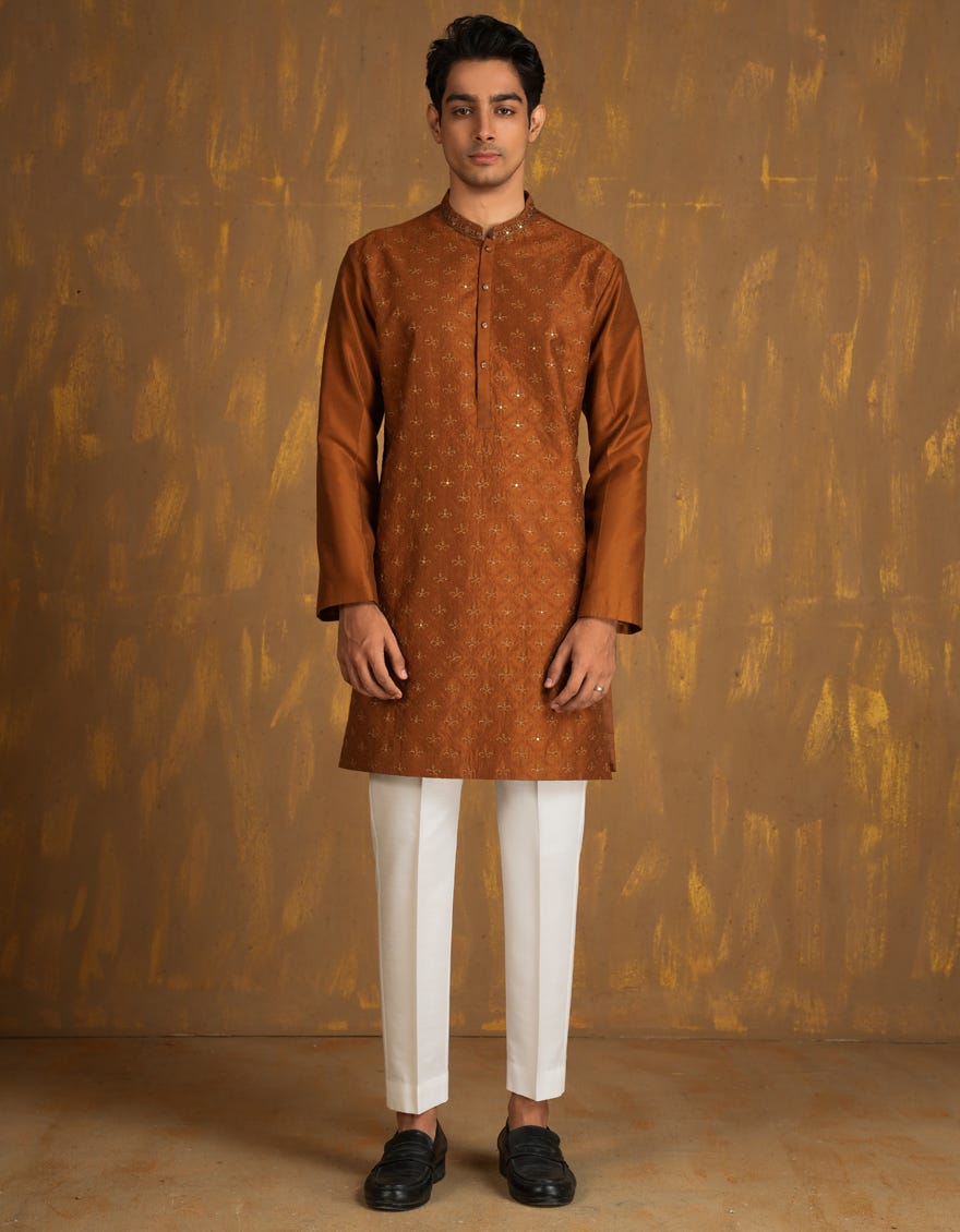Short Description Crafted with care and style, this rust blended special kurta features a classic design, rich fabric, and elegant details, making it perfect for special events and celebrations.