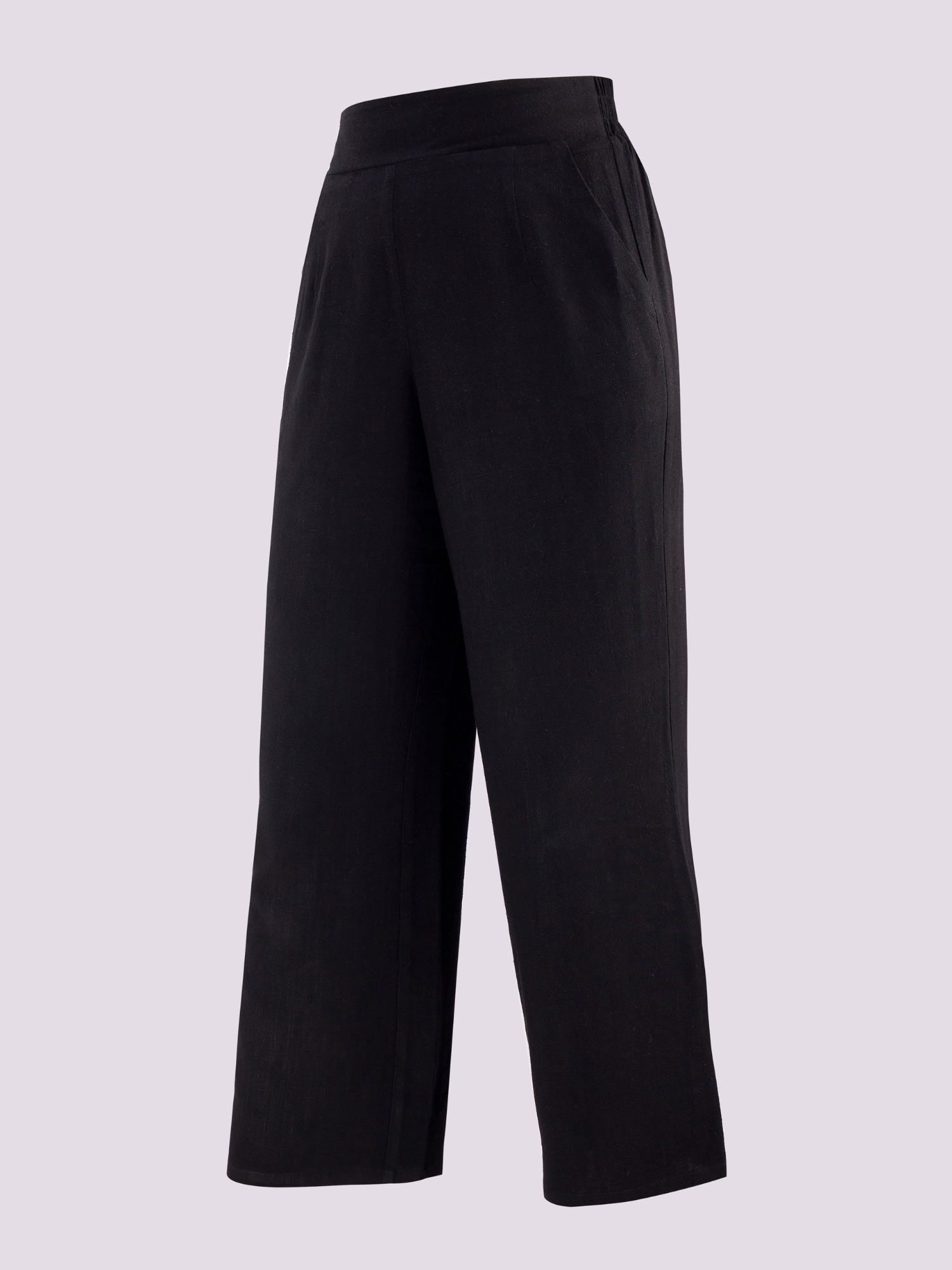 High-waisted trousers with loose fit silhouette. Front is detailed with two darts, enhancing the tailored appearance, while two diagonal side pockets provide practical functionality. An elasticated back waistband ensures a comfortable fit and adds subtle volume to the wide-leg design.