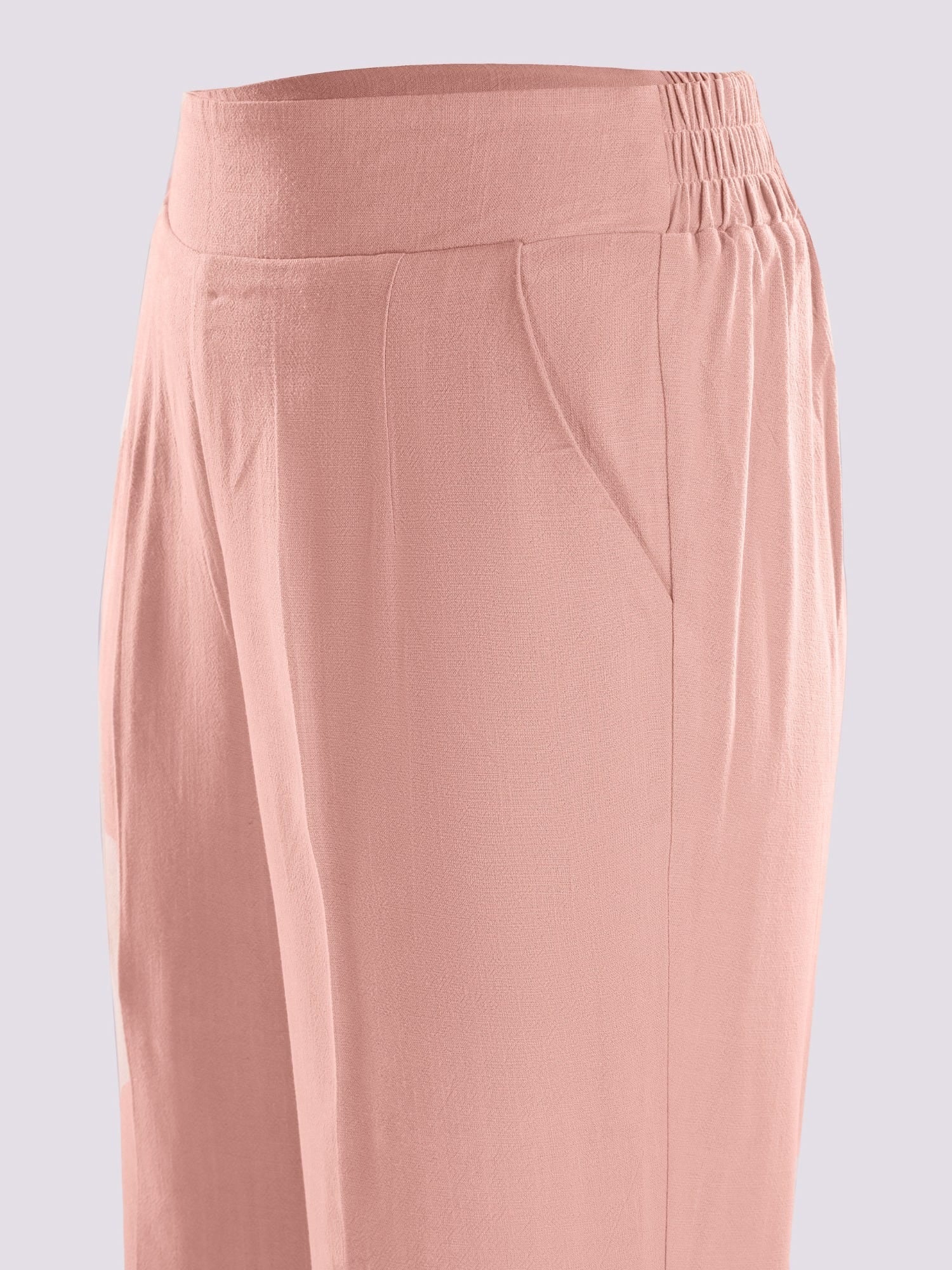 | Short Description | Composition 70% Viscose - 30% Linen Description High-waisted trousers with loose fit silhouette. Front is detailed with two darts, enhancing the tailored appearance, while two diagonal side pockets provide practical functionality. An elasticated back waistband ensures a comfortable fit and adds subtle volume to the wide-leg design. |