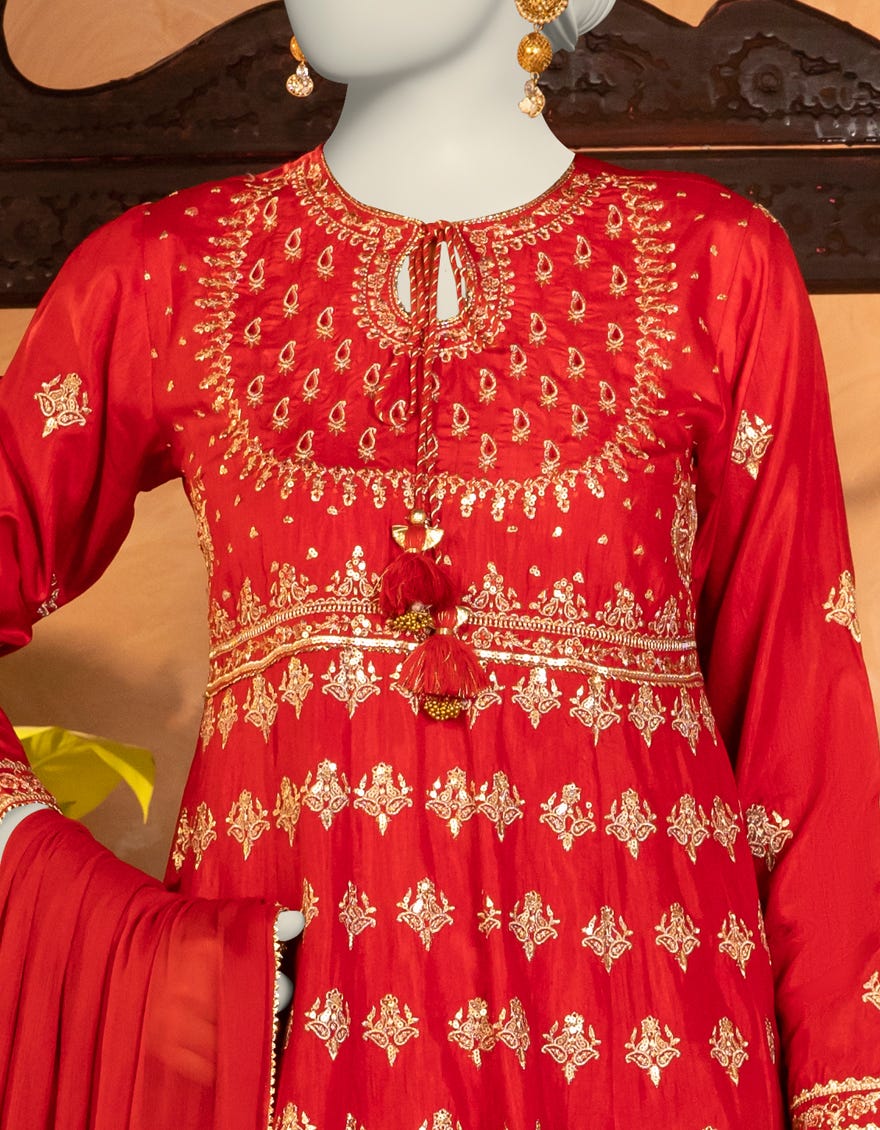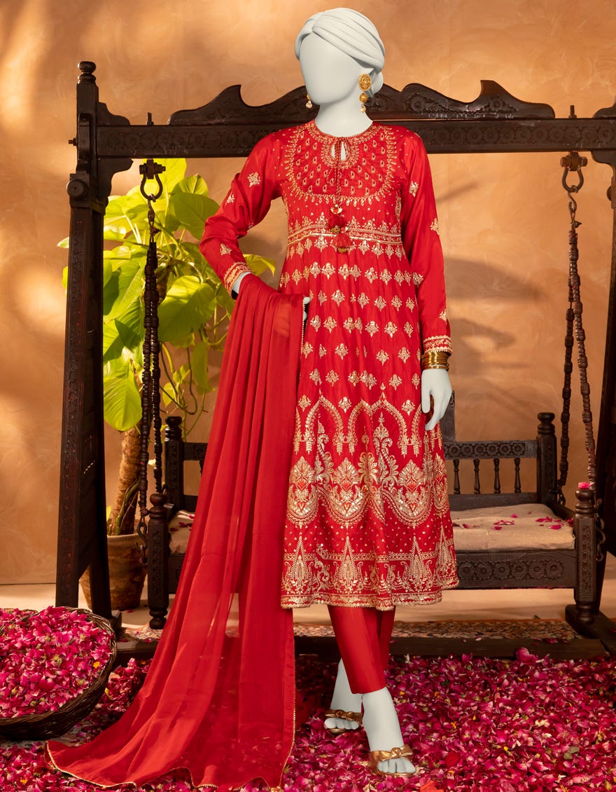 RED RAW SILK EMBROIDERED 3PC STITCHED